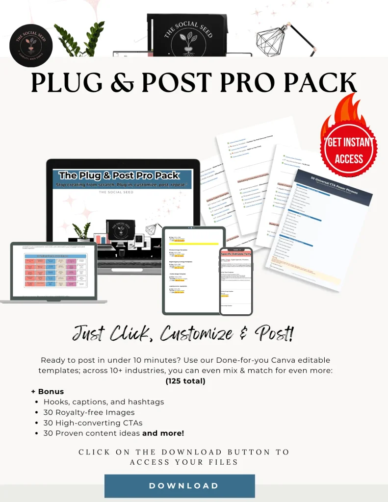 The Plug & Post Pro Pack gives you done-for-you templates, captions, and ideas so you can implement every strategy on this list—without the content marathon.